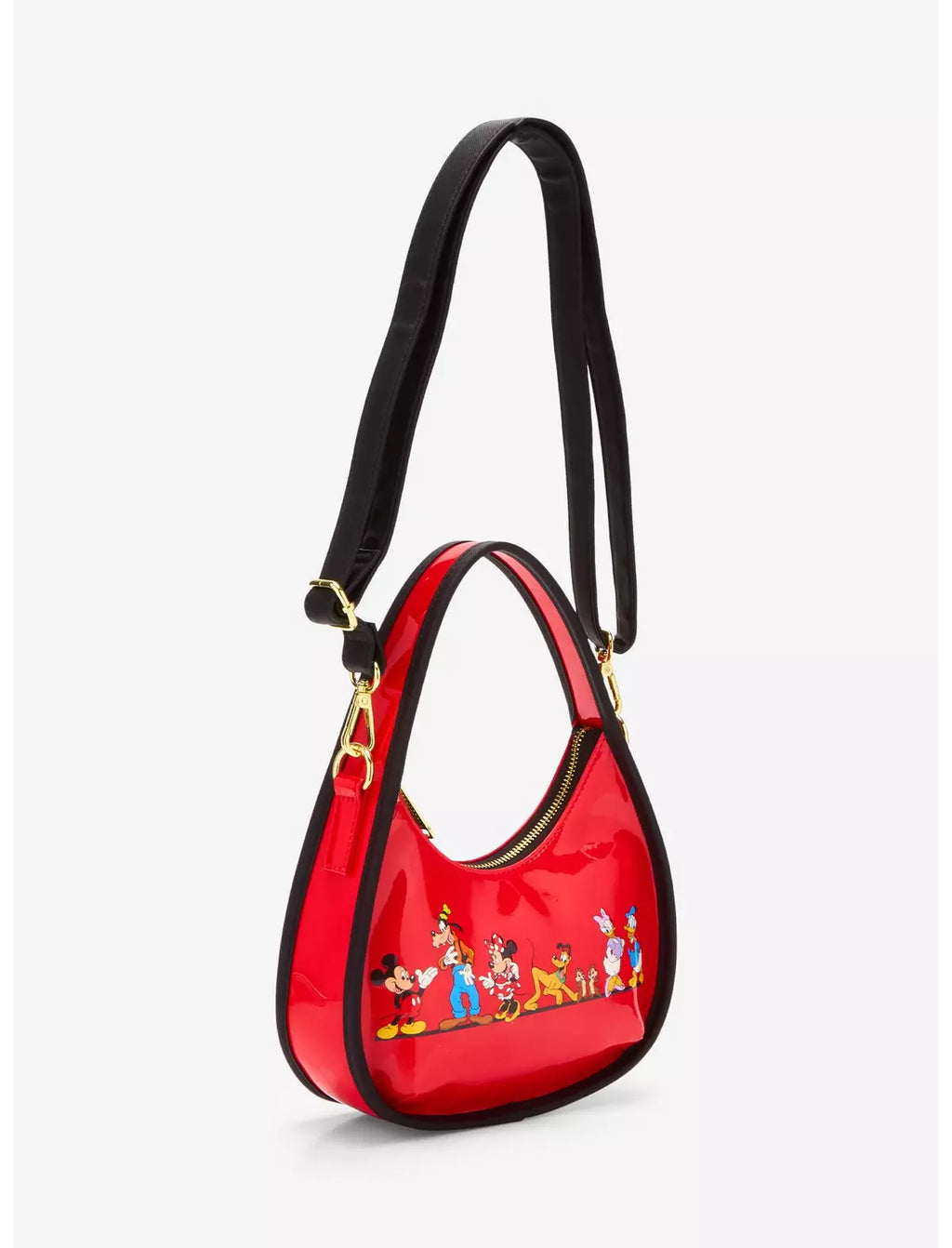 Bring a touch of Disney magic to your look with this fun red vinyl crossbody! Showcasing Mickey and Friends across the front, this bag comes with both a shoulder strap and a detachable crossbody strap—ideal for exploring the Disney Parks.