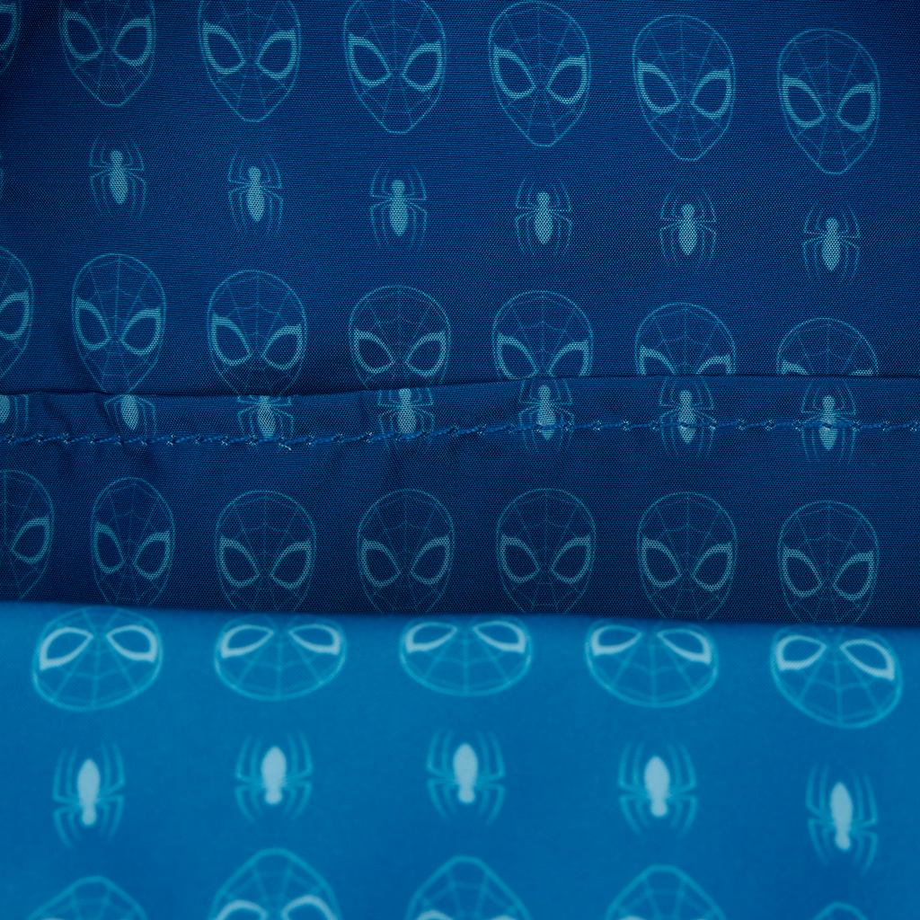 This mini backpack features a sherpa, heart-shaped front pocket featuring Spider-Man's mask. All over the rest of the bag, you'll find various symbols of Spider-Man in squares that look stitched together. Plus, the zipper pull on the front pocket features Spider-Man's mask!
