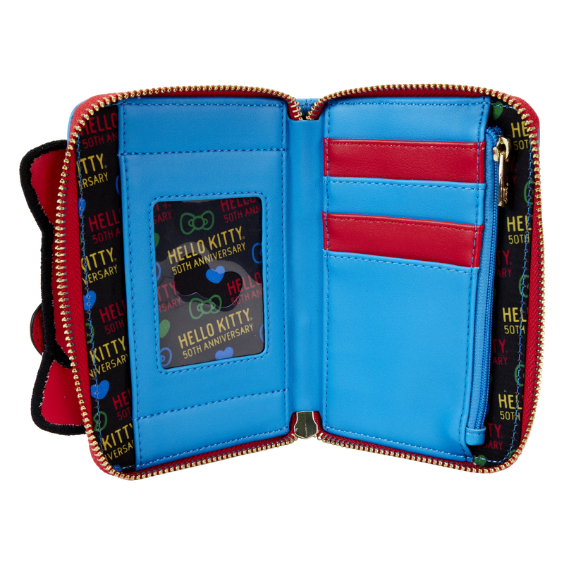 If dialing up your style has a nice ring to it, stay on the line! Our exclusive Loungefly Sanrio Hello Kitty 50th Anniversary Sequin Phone Zip-Around Wallet is brilliantly fun. On the front, Hello Kitty’s adorable face appears in applique, embroidered, and sequined detail. Her signature red bow appears as an applique, and her ears stick up over the top. She’s holding a red sequined phone, and the blue background makes the colours pop. On the back, Hello Kitty shows up as a printed image. She’s answering the phone, and the speech cloud behind her indicates that she’s saying, “Hello Kitty.” Inside, you’ll find approximately four slots for holding cards and one clear slot for displaying your ID. The die-cut shape of a bow, on the clear ID slot, adds a characteristic touch. Make a good call by sharing smiles wherever you go with this accessory.
