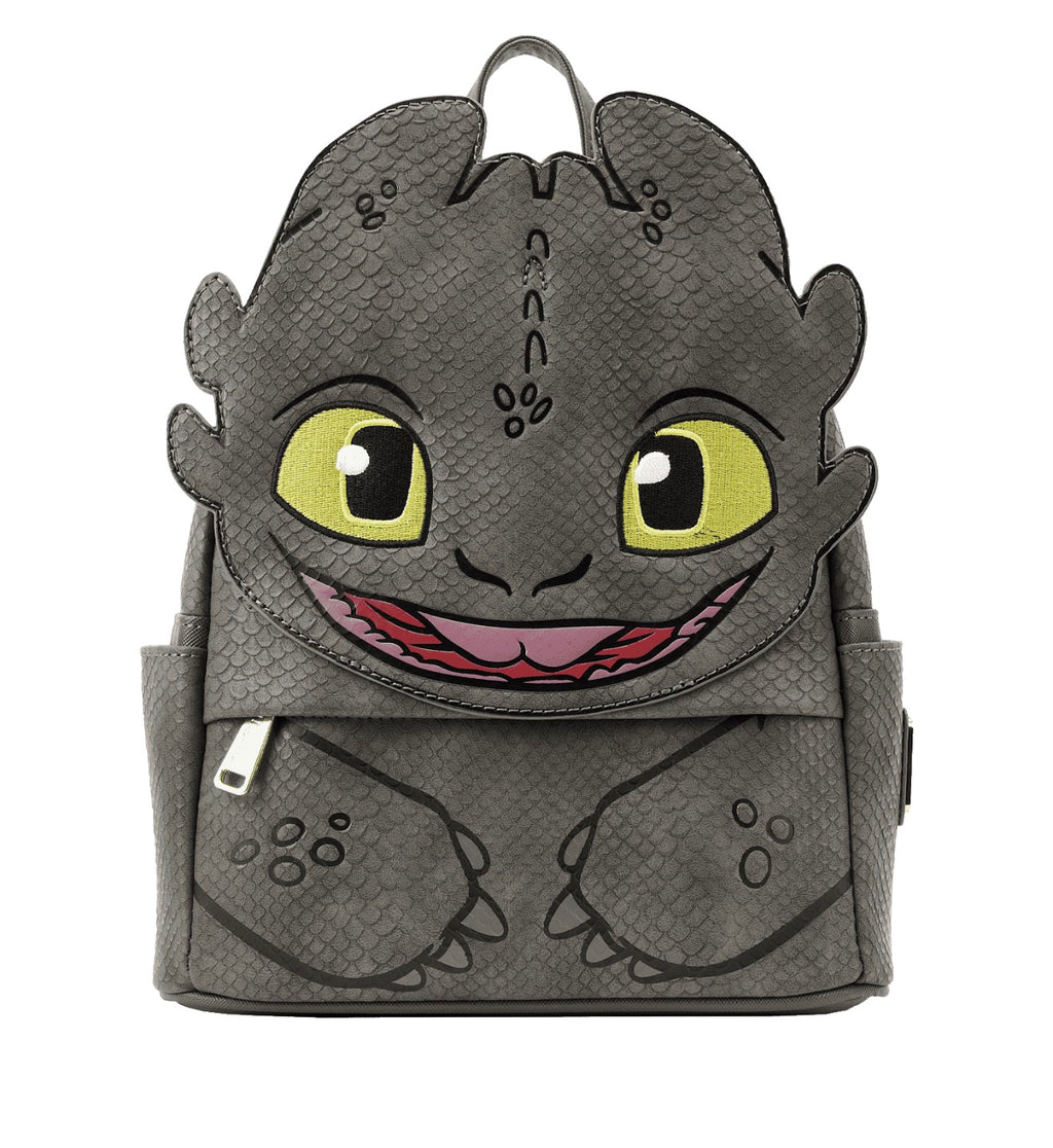 The Loungefly How to Train Your Dragon Toothless Cosplay Mini Backpack is made of vegan leather (polyurethane). Bag has adjustable shoulder straps and sturdy metal hardware. Additional features include applique, embossed, debossed, embroidered, and printed details. Take note of the coordinating inside lining.