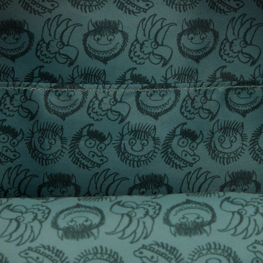 This backpack features Max and the Wild Things in the forest. You'll find Max's crown as the zipper pull on the front pocket. There are other illustrations of Wild Things on the side pockets. The rest of the bag has textured faux leather to match the aesthetic of the art style.